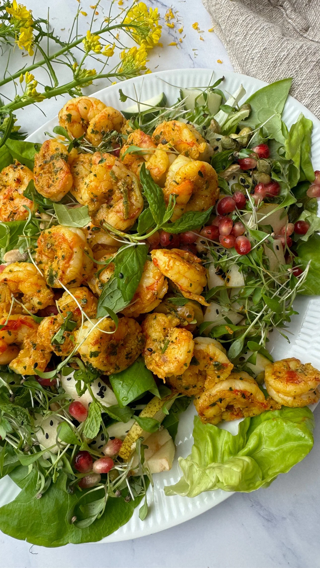 Kælið rækjurnar í smá tíma og setjið þær ofaná salatið og toppið með góðri sítrónuolíu, salti, pipar, sprettum/ spírum