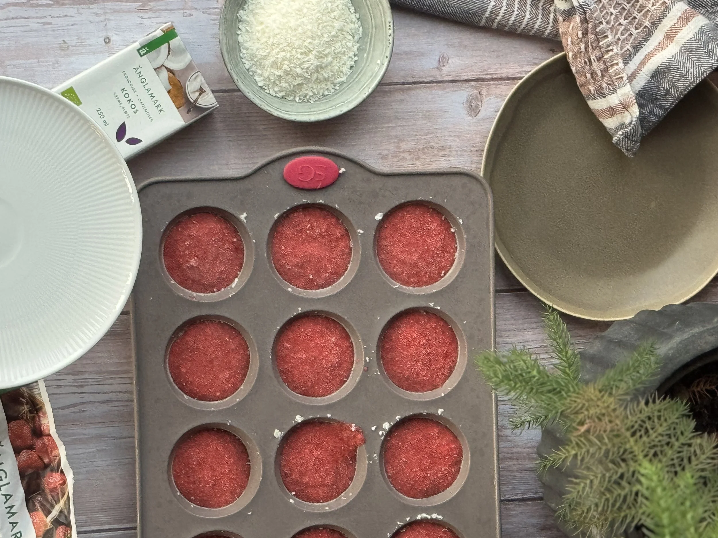 Setjið fyrst kókosblönduna í muffinsform og því næst jarðarberja-chia blönduna ofaná.