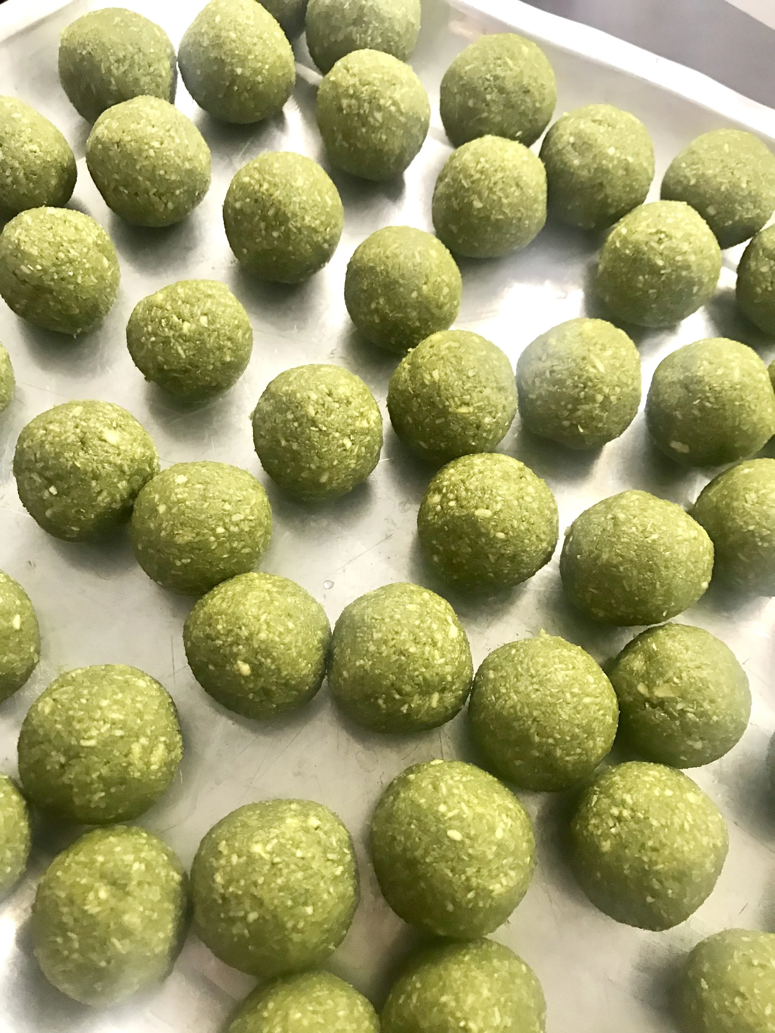 Öllu blandað saman í matvinnsluvé, hnoðað í litlar kúlur og sett í frysti.