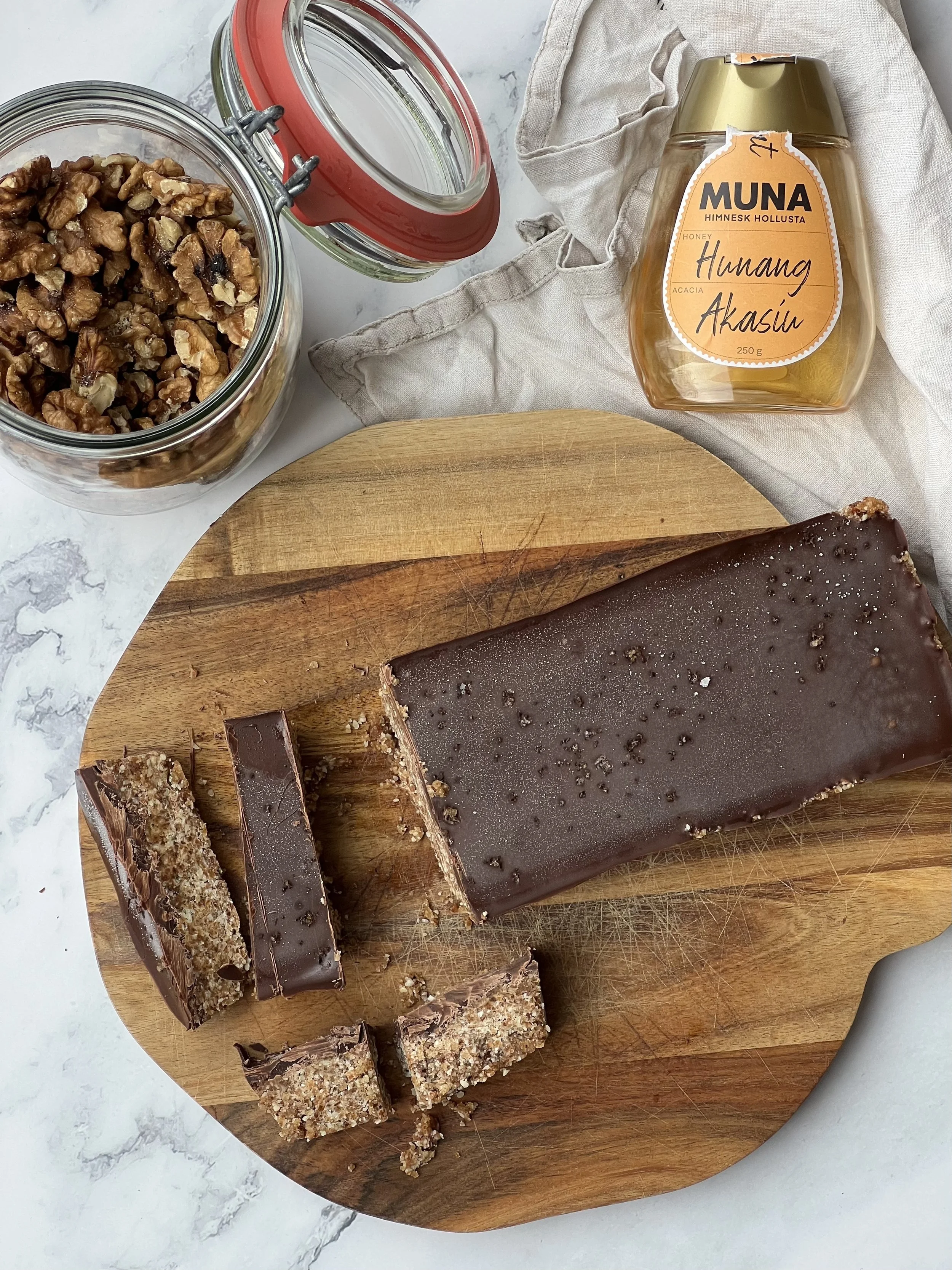 Þessi stykki eru eingöngu búin til úr valhnetum, möndlum, döðlum, möndlusmjöri, akasíuhunangi, súkkulaði og lakkríssalti - svo auðvelt að gera og eiga inni í frysti.