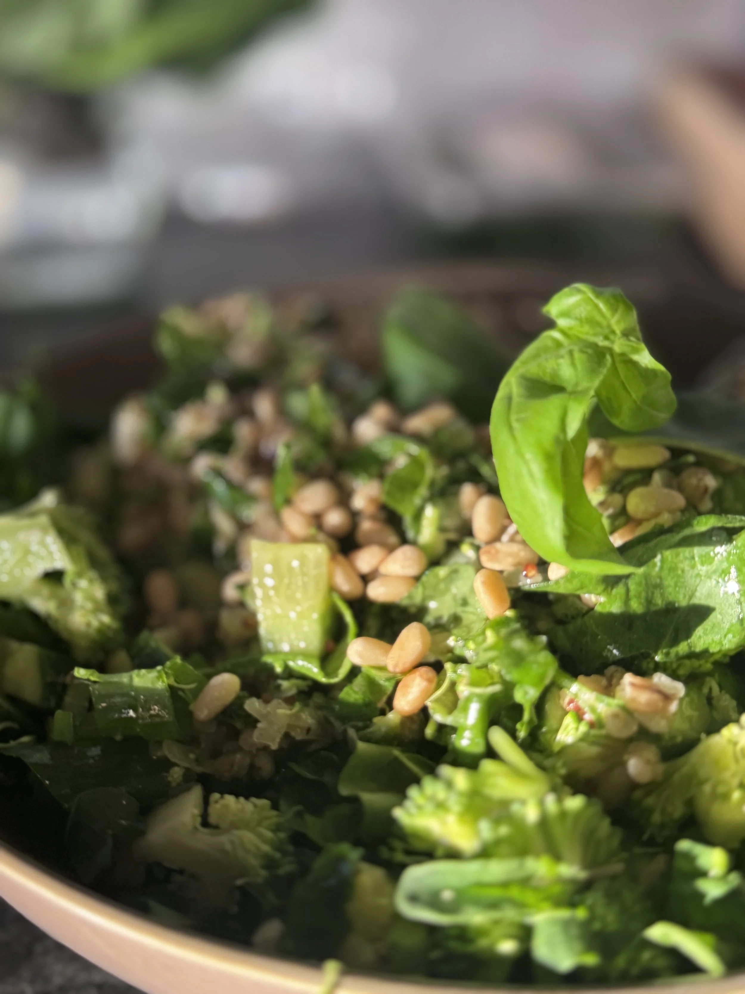 Þegar bankabyggið er soðið og allt vatn gufað upp, færið það þá yfir í stóra skál, hrærið öllu græna saman við og hellið dressingunni yfir og hrærið aftur. Það má alltaf bæta við meira af parmesan og auka salt og pipar og toppa með ristuðum furuhnetum.