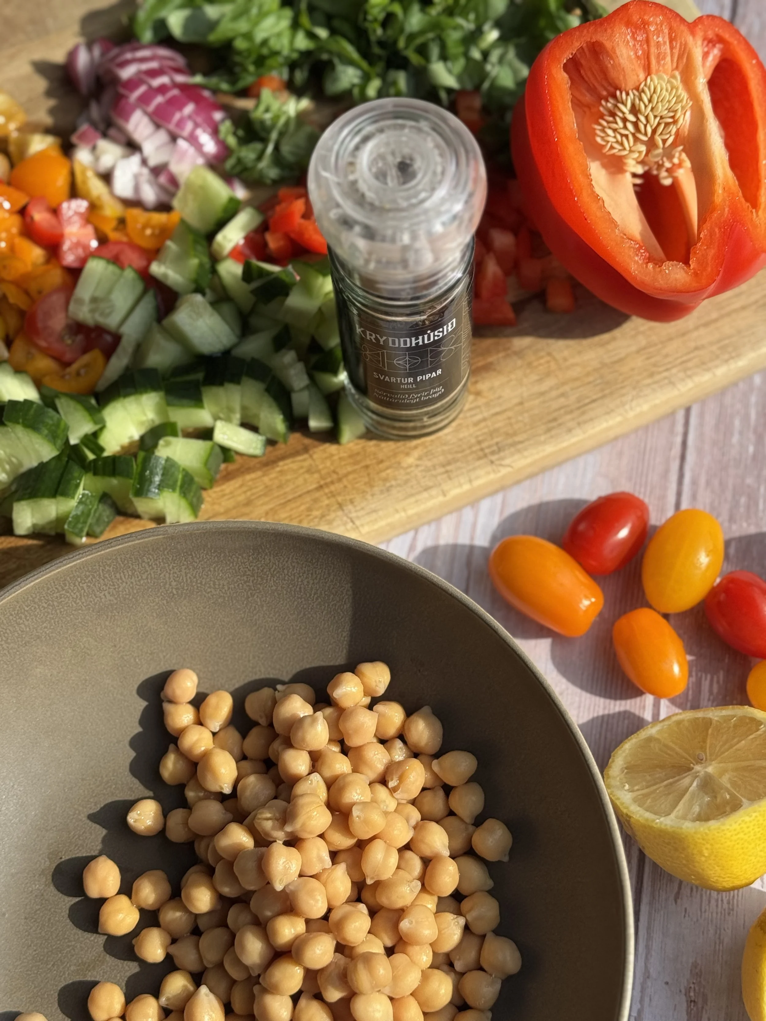 Einstaklega bragðgott, fyllandi og trefjaríkt salat: kjúklingabaunir + grænmeti = yfir 10 gr trefjar per skammt.