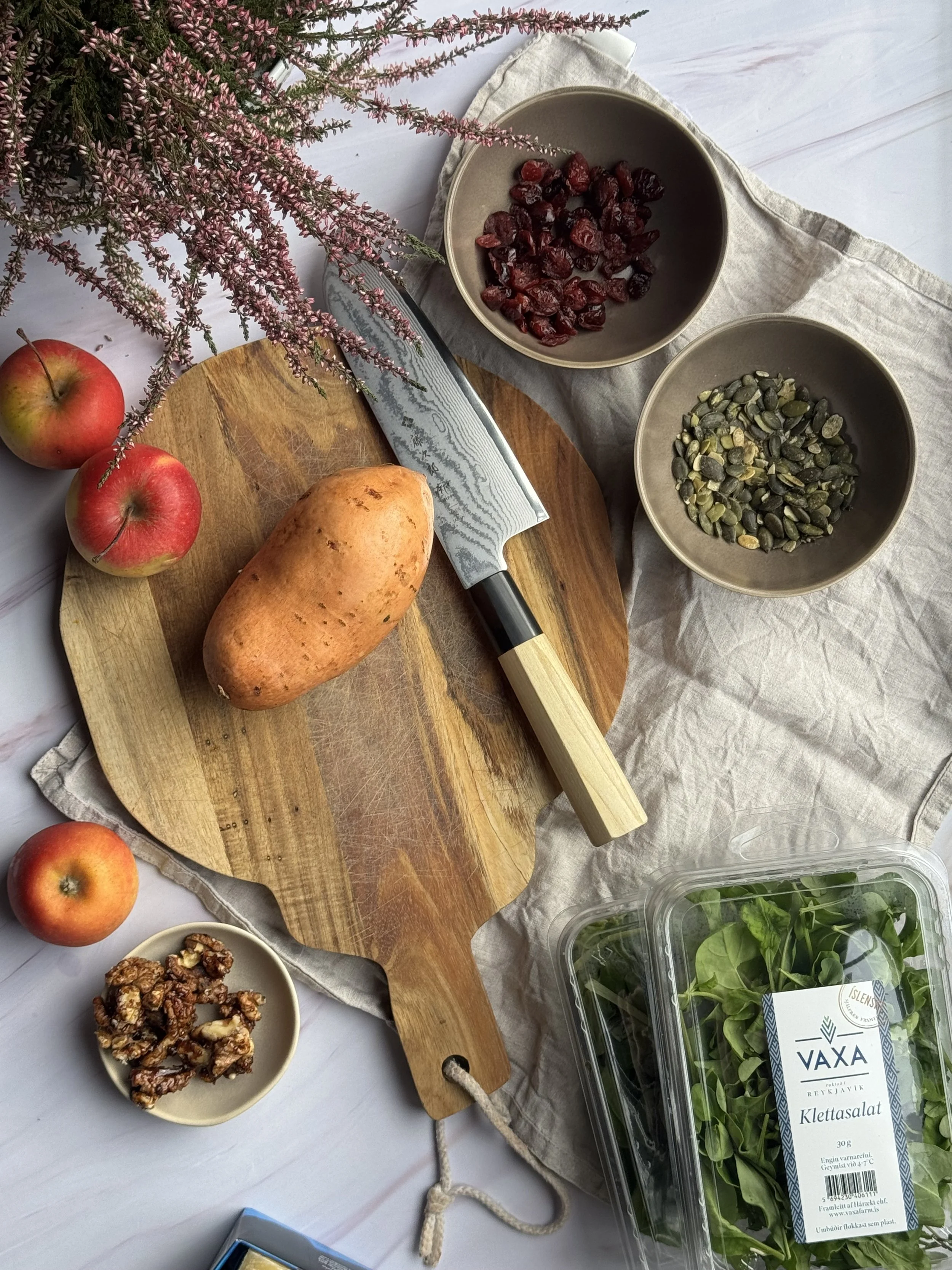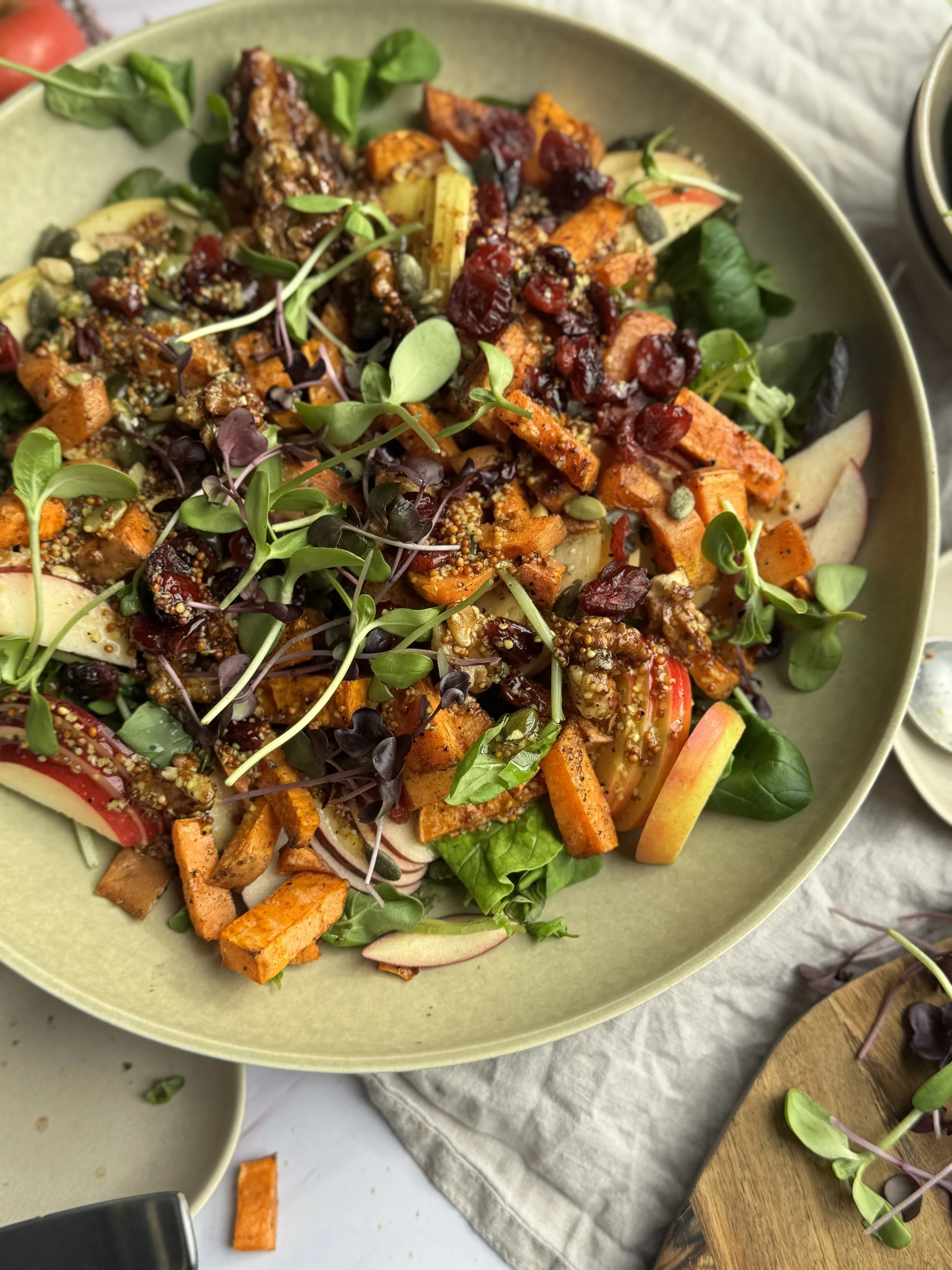 Þetta salat þurfa allir að prófa, fallegt og dásamlegt matar mikið salat með eplum, trönuberjum, sætum kartöflum og auðvitað nóg af grænu og fersku salati og sprettum.