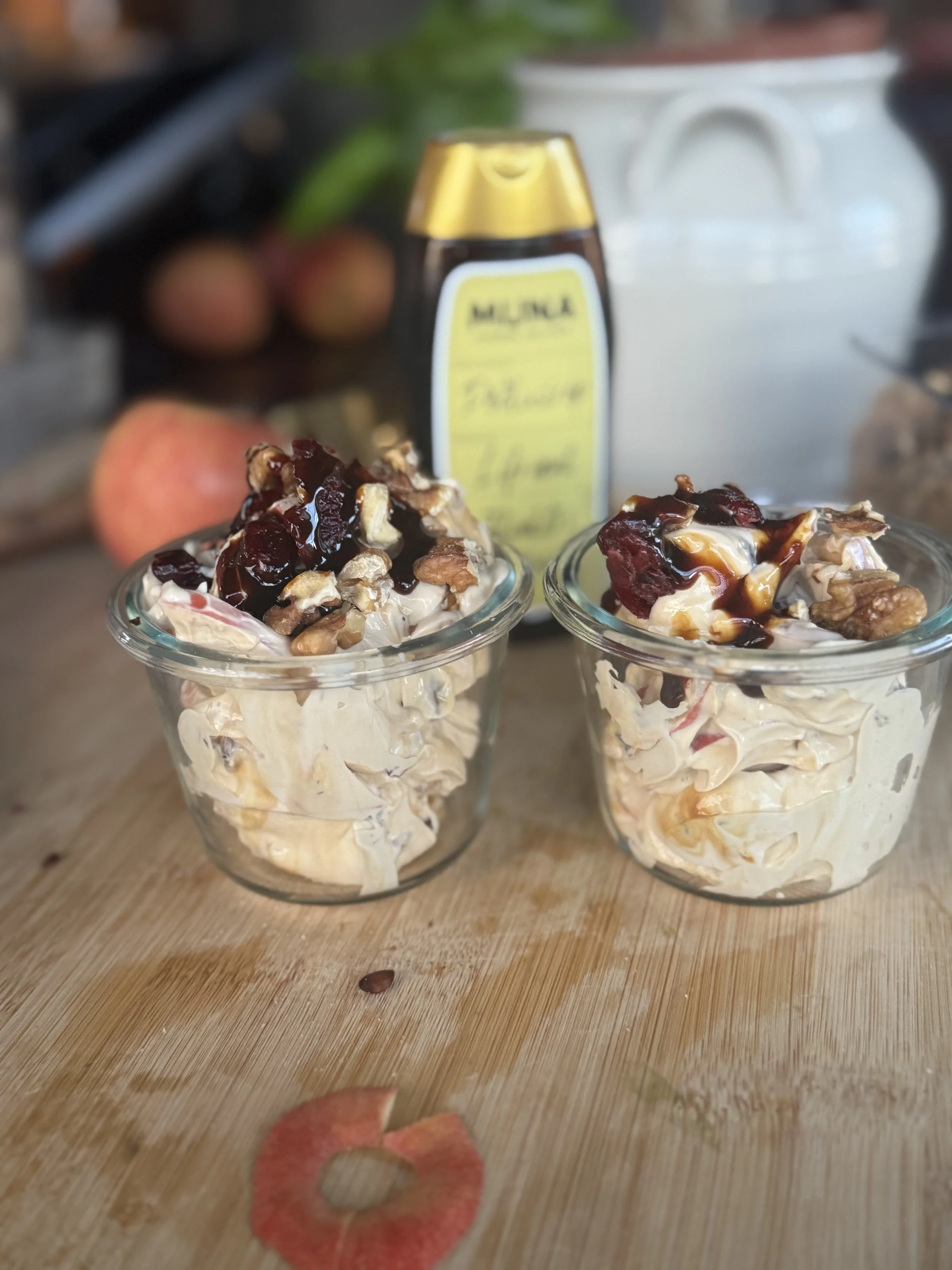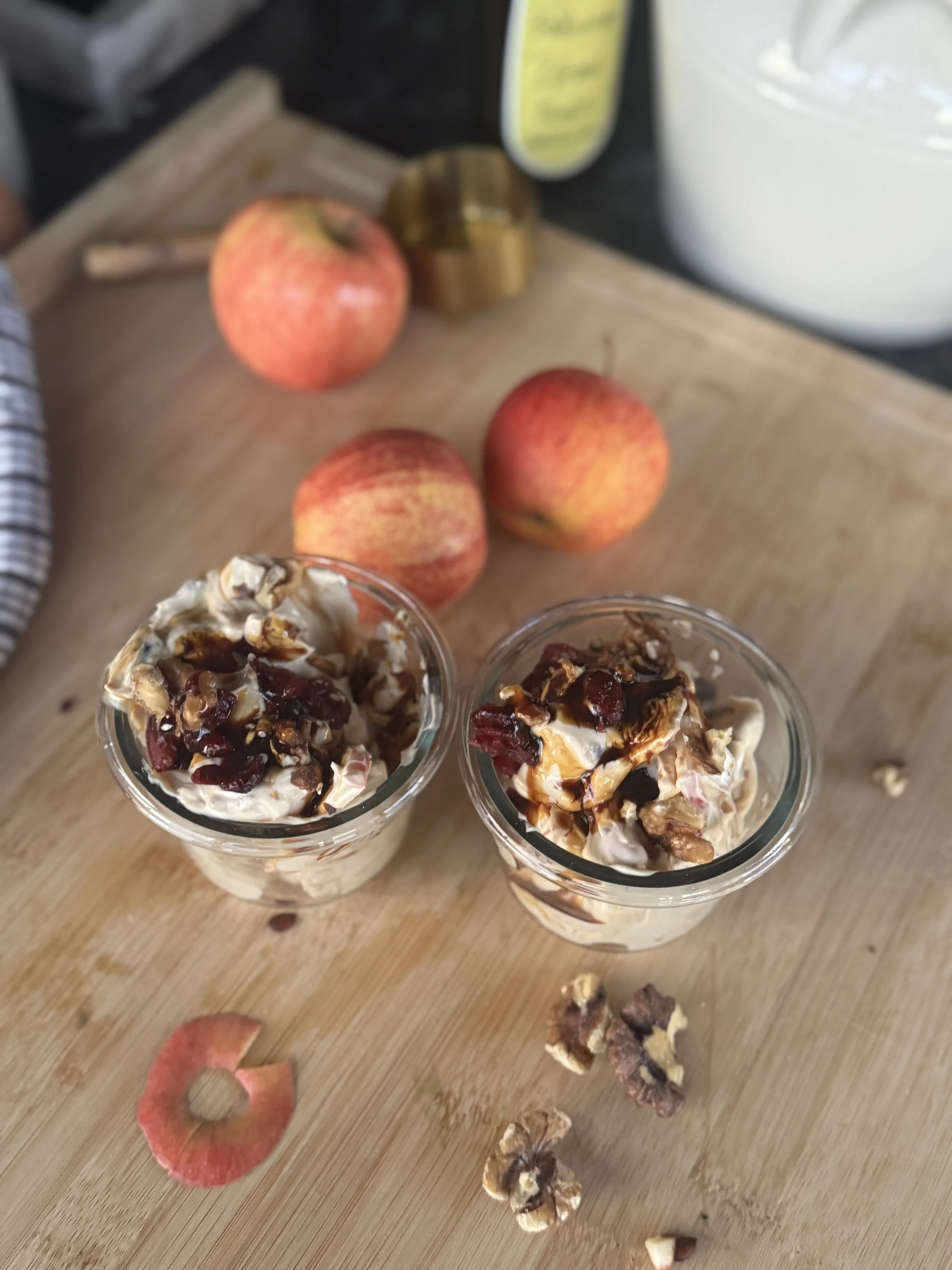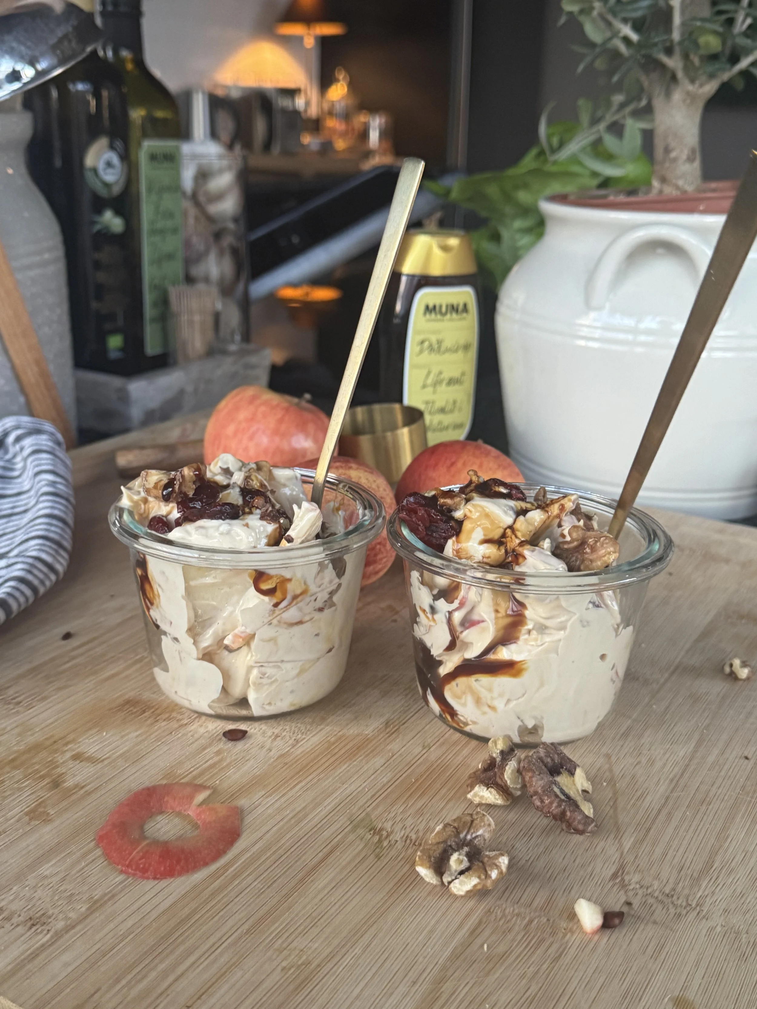 Hrærið eplið, trönuber og valhnetur út í jógúrtblönduna og blandaðu varlega. Setjið í tvö glös og skreytið með nokkrum valhnetum, trönuberjum og dropa af döðlusýrópi áður en borið er fram.