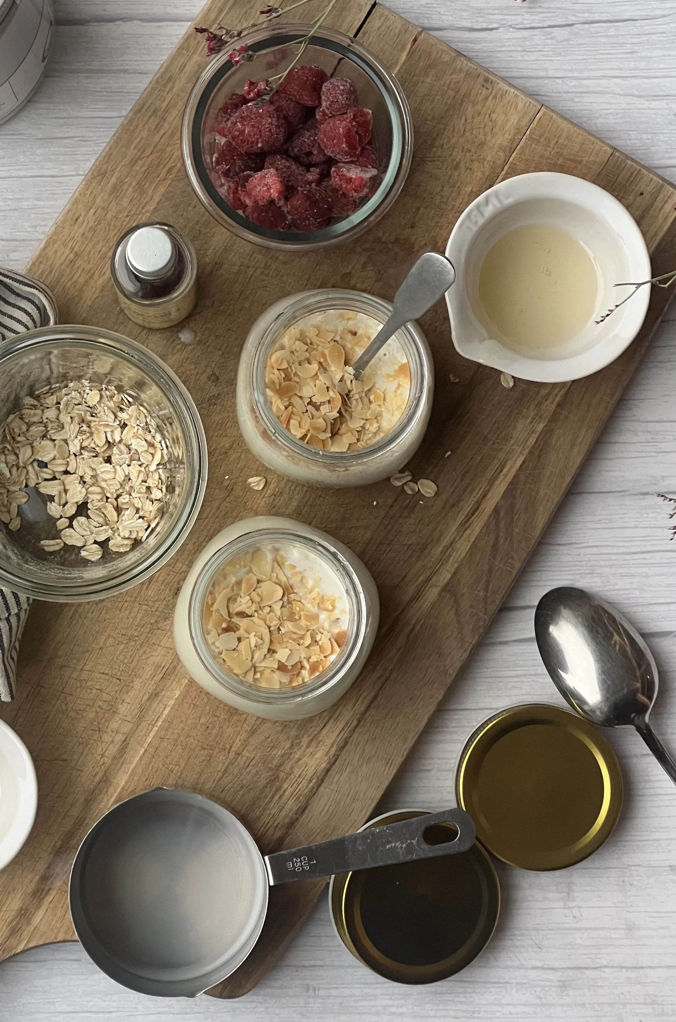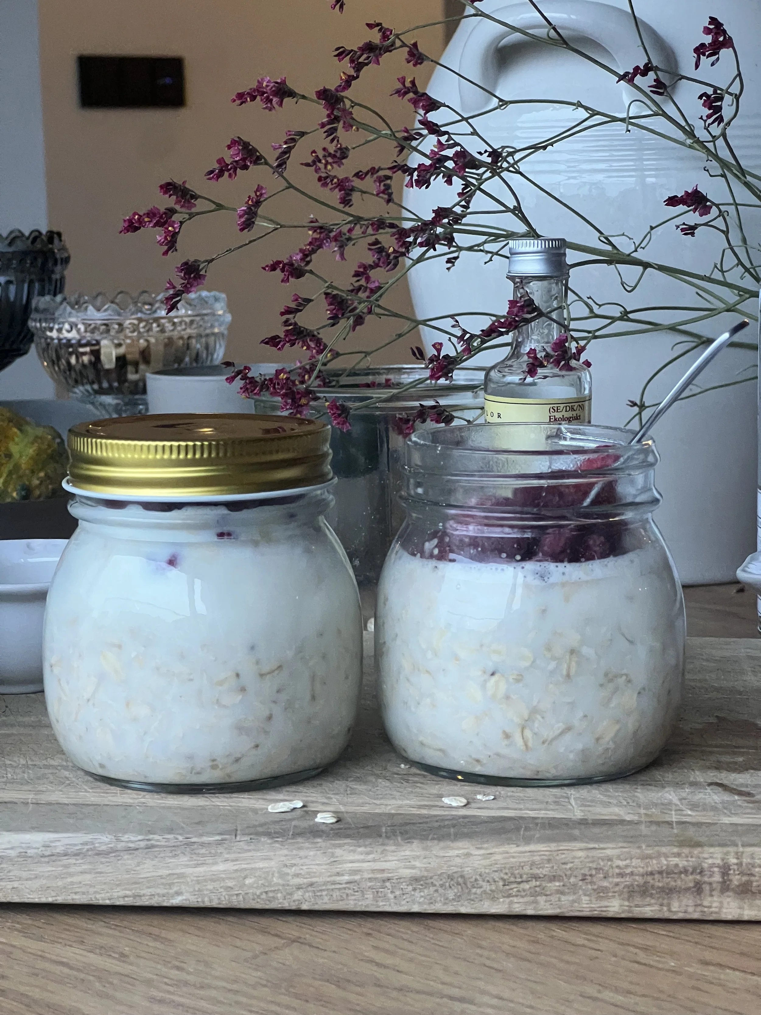 Hrærið vel saman og setjið svo frosnu hindberin ofan á og lokið krukkunum og geymið inn í ísskáp yfir nótt.