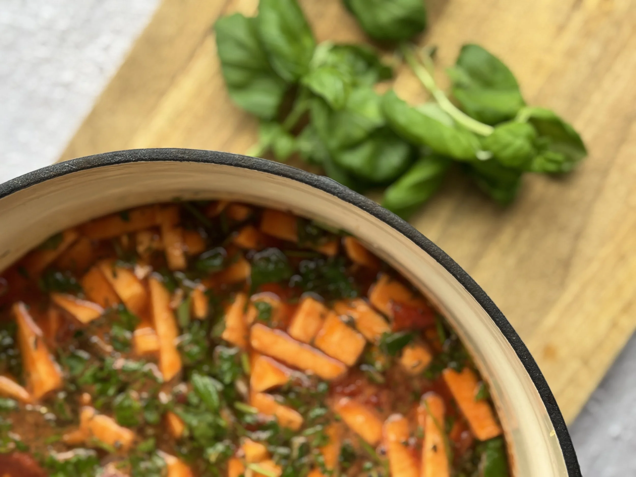 Hitið ólífuolíu í potti og steikið lauk og hvítlauk í um 2 mínútur eða þar til laukurinn er orðin glær. Bætið við gulrótum og sætri kartöflu, steikið í aðrar 2–3 mínútur.