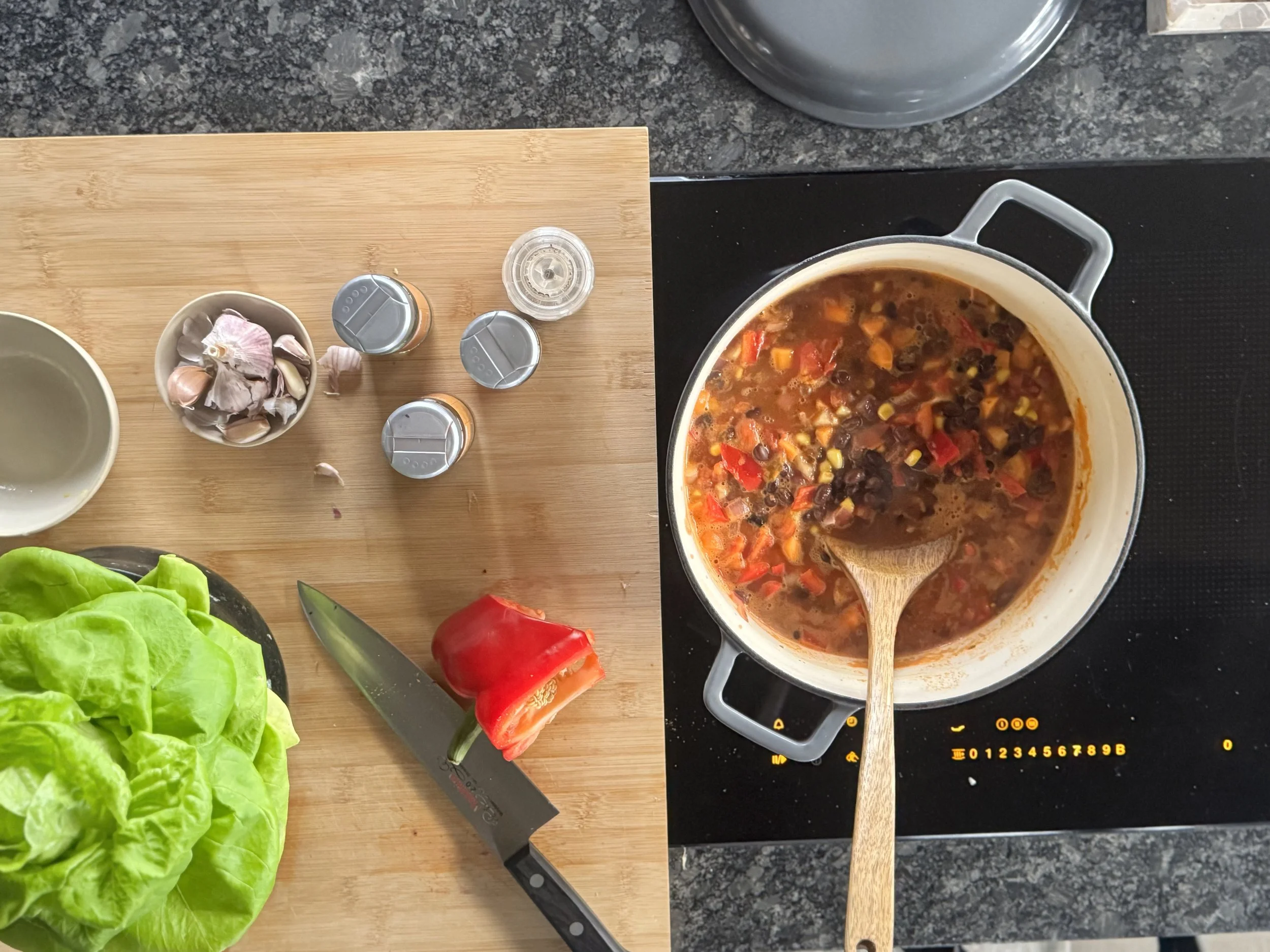 Hrærið hvítlauk, papriku og gulrótum saman við. Blandið chilidufti, kúmeni, papriku og oregano saman við. Hrærið svörtum baunum, söxuðum tómötum, grænmetissoði og maís saman við.